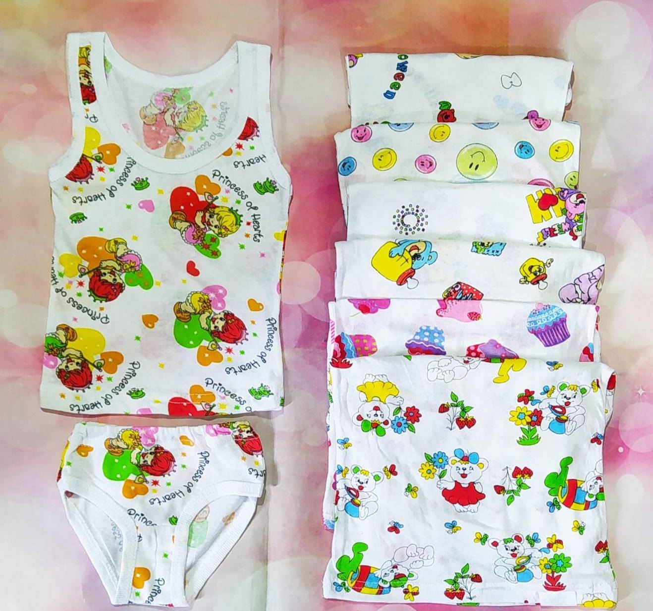 Детский трикотажный комплект для девочек (майка + трусы) из кулира. Ткань в детском трикотажном комплекте приятная к телу и при достаточно длительном ношении у ребенка не будет вызывать раздражение на теле. Детские трусы в комплекте для девочек эластичны, не стесняют движения ребенка. Детские трусы для девочек на талии и по ногам обработаны мягкой резинкой