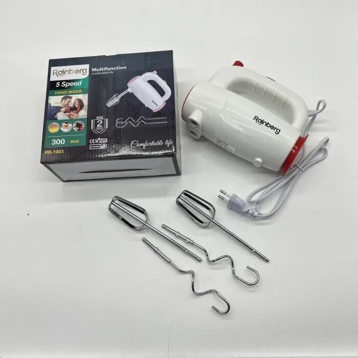 Ручной миксер Rainberg относится к типу довольно компактных, но очень мощных моделей с мотором, максимальной мощностью 400 Вт. Данный прибор оборудован 5 скоростными режимами работы, позволяющими эффективно взбивать продукты различной плотности. В комплекте с миксером Вы найдете дополнительные крюки для замешивания теста, что по достоинству смогут оценить те хозяйки, которые любят радовать свою семью различными выпечками. А два венчика для взбивания позволят быстро и качественно взбить нужный Вам продукт. С помощью ручного миксера Rainberg вы с легкостью порадуете всю семью вкусным воздушным десертом. Получить смеси разной консистенции вы сможете благодаря 5 скоростным режимам. Воздушное или более густое тесто вам помогут замесить две насадки для теста. Миксер Rainberg – прибор очень удобный и легкий в использовании и очистке. Один из самых лучших домашних миксеров, который будет помогать готовить ваши любимые блюда. Данный миксер обладает отличной плавностью оборотов и большим выбором скоростей вращения насадок. Корпус миксера изготовлен из пластика, а насадки из нержавеющей стали, а продуманная до мелочей эргономика придает дополнительный комфорт в использовании данного миксера. Rainberg оптимальное соотношение функциональности и цены. Характеристики Ручной миксер Rainberg 1101: Материал корпуса Пластик. Напряжение 220 -240В. Мощность 400 Вт. 5 скоростей. В комплект входит: Ручной миксер насадка для взбивания 2 шт. насадка для теста 2 шт. инструкция.