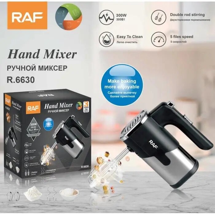 Кухонный электрический миксер RAF R-6630 просто незаменим на вашей кухне Он прост в работе, но при этом многофункционален Прибор способен взбить продукт до любой консистенции Скорость и качество смешения ингредиентов зависит от мощности устройства При такой мощности вы сможете довольно быстро приготовить крем или замесить тесто, настроив устройство на заданную скорость