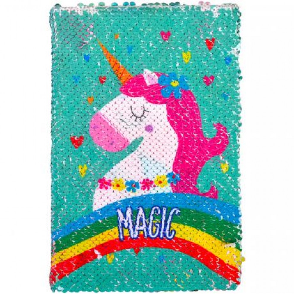 Блокнот з паєтками, які змінюють колір при проведенні по них рукою. В твердій палітурці 76 аркушів, клітинка, кремовий лист. Розмір 21 * 14,5 см.