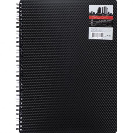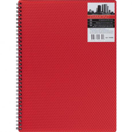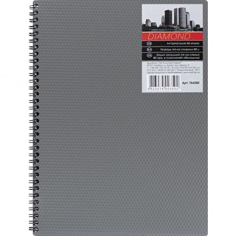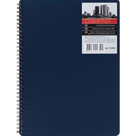 Записна книжка формату А4 з пластиковою обкладинкою на спіралі. Має 80 аркушів у клітину з білого офсетного паперу щільністю 60 г/м². Використовується поліпропілен. Доступні різні кольори.