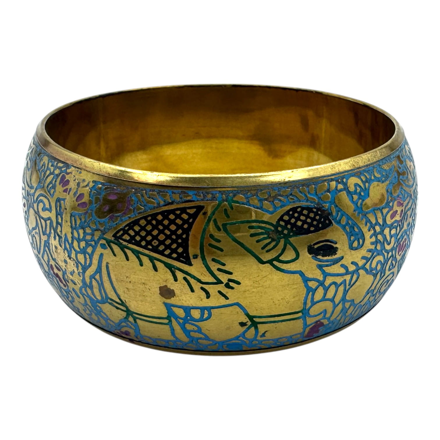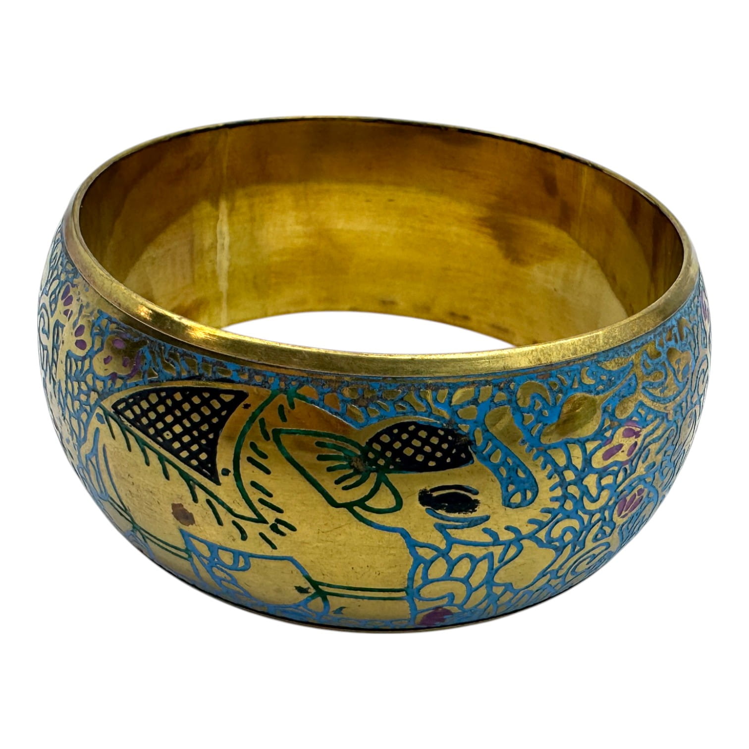Оригинальный бронзовый браслет с яркой эмалью и гравировкой в восточном стиле. Украшен изображением слонов — символов силы, мудрости и благополучия. Благодаря насыщенным цветам и этническому дизайну, браслет станет выразительным акцентом вашего образа и привлечёт внимание к деталям.