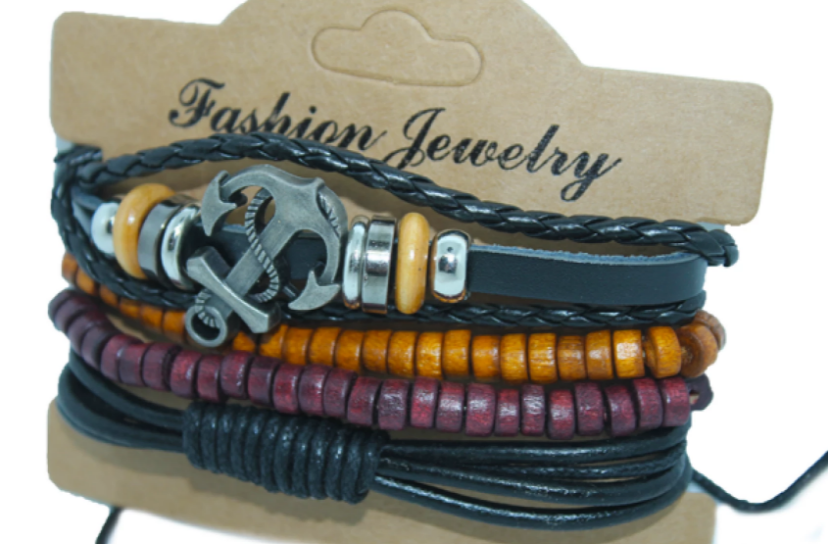 Матеріал: шкір. зам. + дерево Браслети універсальні за розміром (на затяжках або на волосіні) Бусини та фурнітура на браслетах: латунні, металеві, пластмасові, дерев'яні