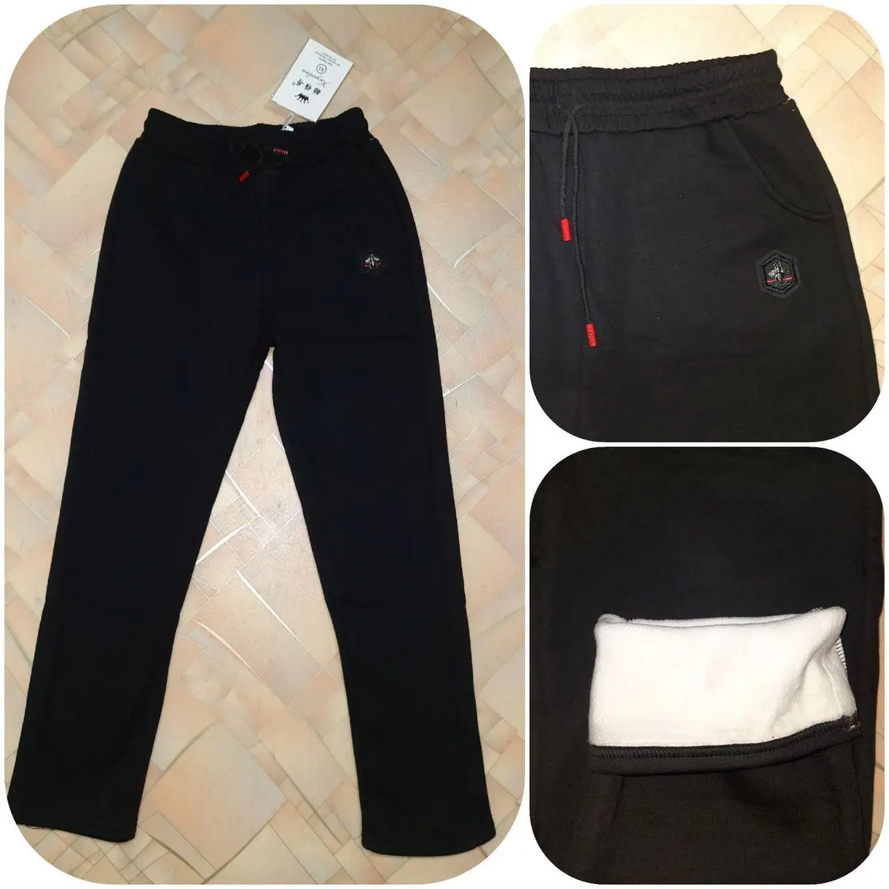 Дуже теплі, щільні штани на хутрі. З кишенями спереду і ззаду і стразами. Верх – щільна гарна тканина. Усередині - щільне плюшеве хутро. Можна носити як штани, або як лосини.