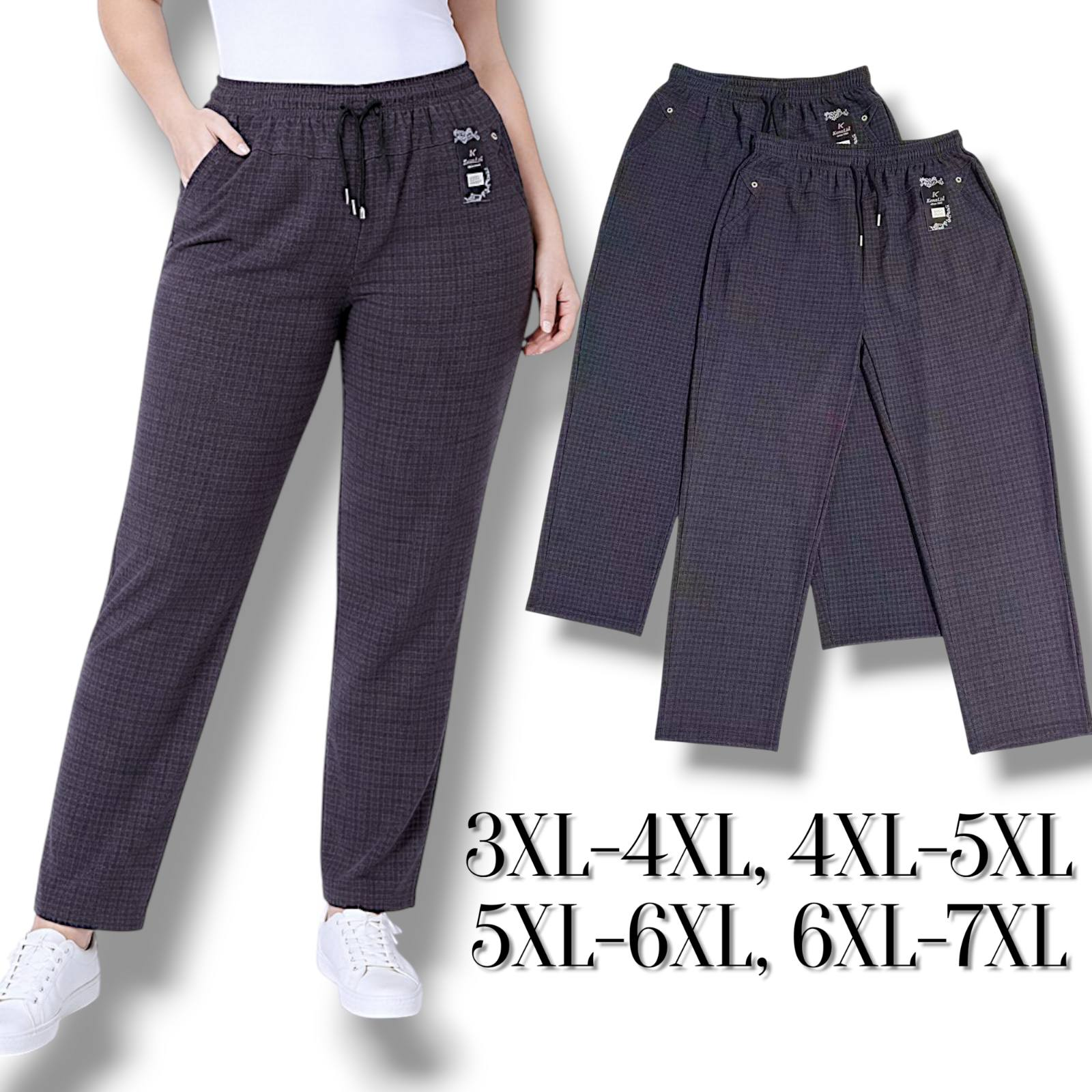 Жіночі демісезонні брюки в клітинку. Фірми Kenalin. Напівбатал. Колір сіро-синій. Розміри: 3XL-7XL.