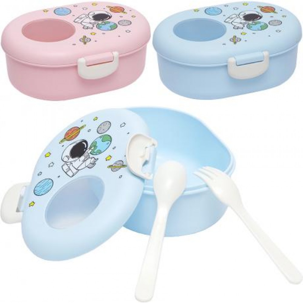 Зручний контейнер для їжі виконаний в яскравому дизайні, його зручно брати з собою в школу, на прогулянку, пікнік або спортивні заняття. Матеріал: харчовий пластик.Є вилка, ложка. Розмір: 18*13*7см