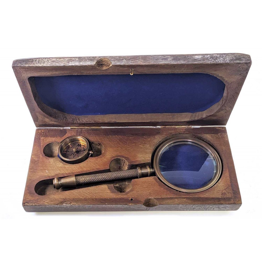 Лупа с компасом в деревянном футляре (23.5х11х4 см) Лупа (d-8см. h-20см.) Компас (d-3.8см)) код 28236