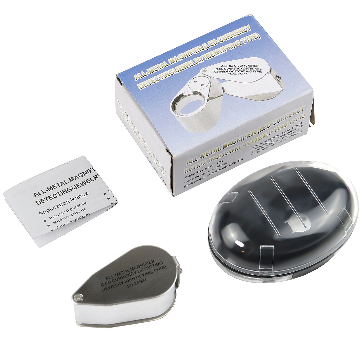 Профессиональная складная лупа с увеличением 40 раз и линзой диаметром 25 мм. Корпус изготовлен из прочного металла и акрила для надежности и долговечности. Идеально подходит для ювелиров, коллекционеров монет, проверки банкнот, камней, марок, микродеталей и визуального контроля качества.