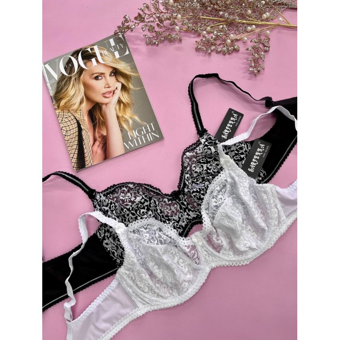 ОПИСАНИЕ Ажурный бюст без поролона на хлопковой подставке. Бретель - несъемная, спина - гладкая.