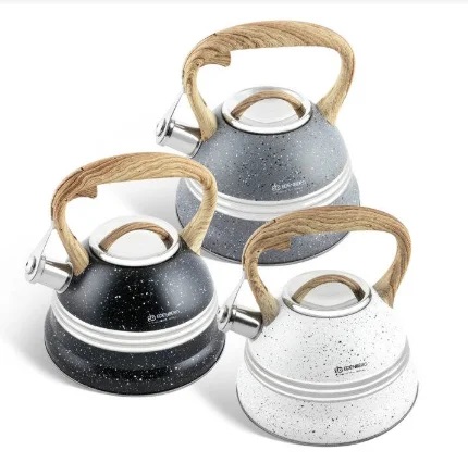 Чайник из нержавеющей стали с наружным мраморным покрытием торговой марки Edenberg на 3 литра станет неотъемлемой частью Вашей кухни. Двойное капсульное индукционное дно в чайнике из нержавеющей стали прекрасно подойдёт как для индукционных плит, так и для газовых, электрических или стеклокерамических плит. Ручка чайника имеет эргономическую форму и не нагревается при использовании чайника. Свисток чайника из нержавеющей стали откидывается легким нажатием кнопки на ручке.
