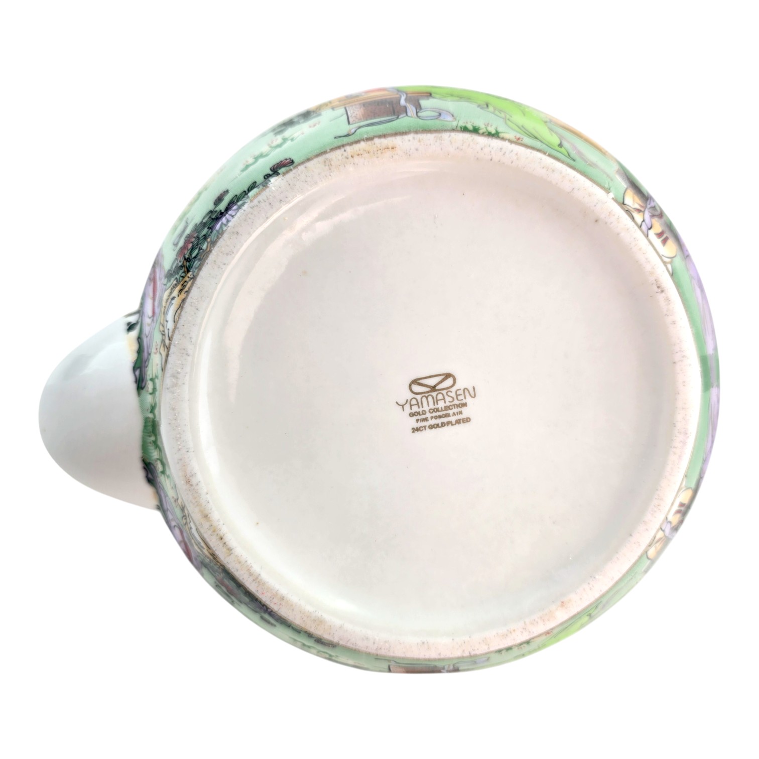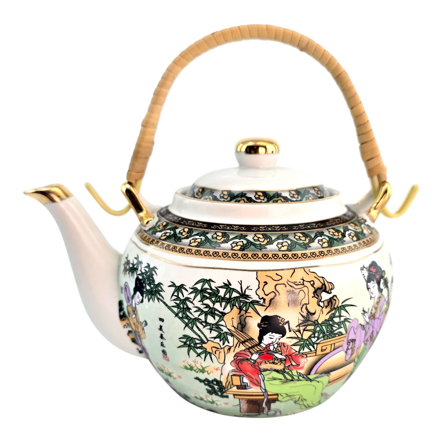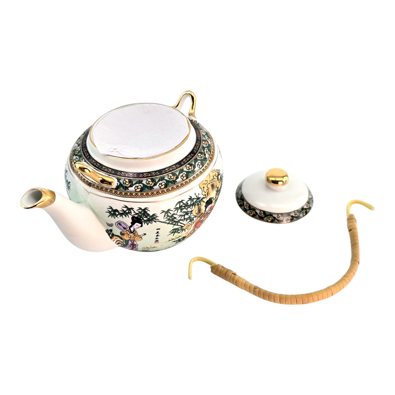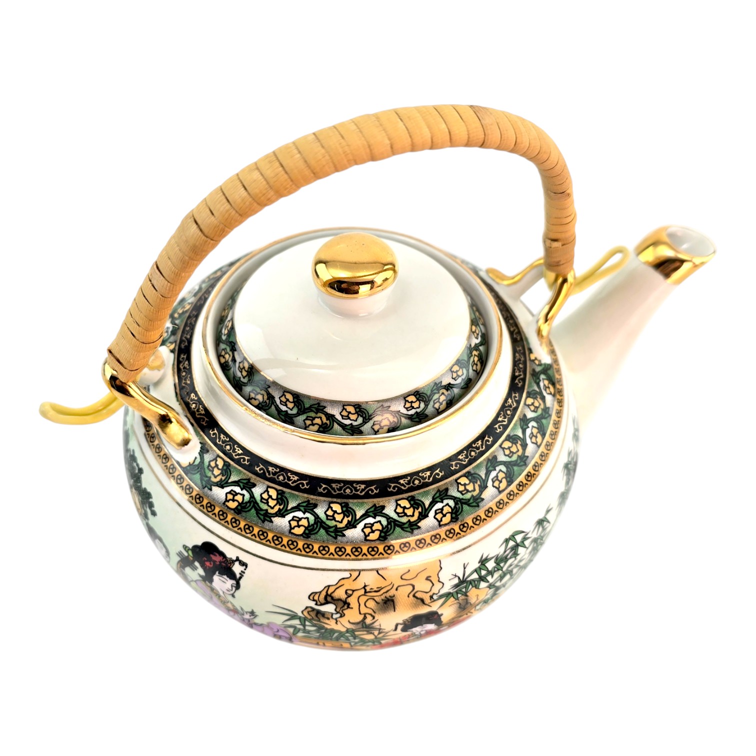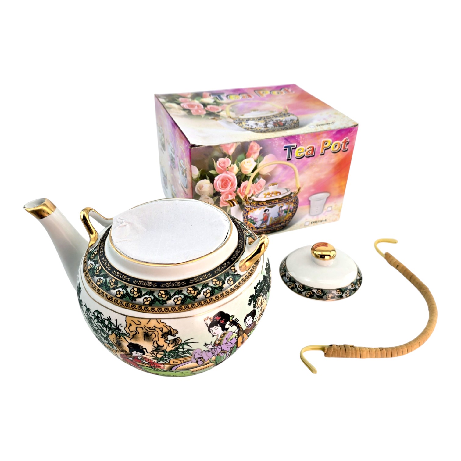 Фарфоровый чайник Yamasen из серии Gold Collection для заваривания листового чая дома или в офисе. Внутри есть съемное фарфоровое ситечко, чтобы удобно контролировать крепость настоя и не ловить листья в чашке. Декор в восточном стиле с сюжетным рисунком и золотистыми акцентами, на дне есть маркировка 24K gold plated. Объем 900 мл - комфортно на 3-5 чашек, а носик помогает наливать аккуратно. Съемная ручка с обмоткой под ротанг удобна для переноски и мойки отдельно. Подходит как подарок для любителей чая и красивой чайной посуды.