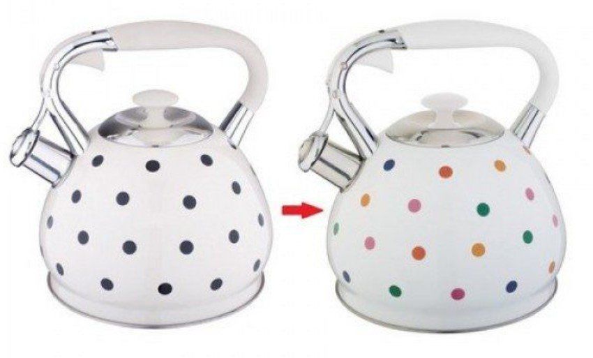 EDENBERG EB-1908 - металлический чайник со свистком объёмом 3 литра и 2-х слойным капсульным дном. Но фишка чайника в том, что при нагреве изменяется цвет рисунка, т.е. чёрные полосы изменяются на разноцветные.