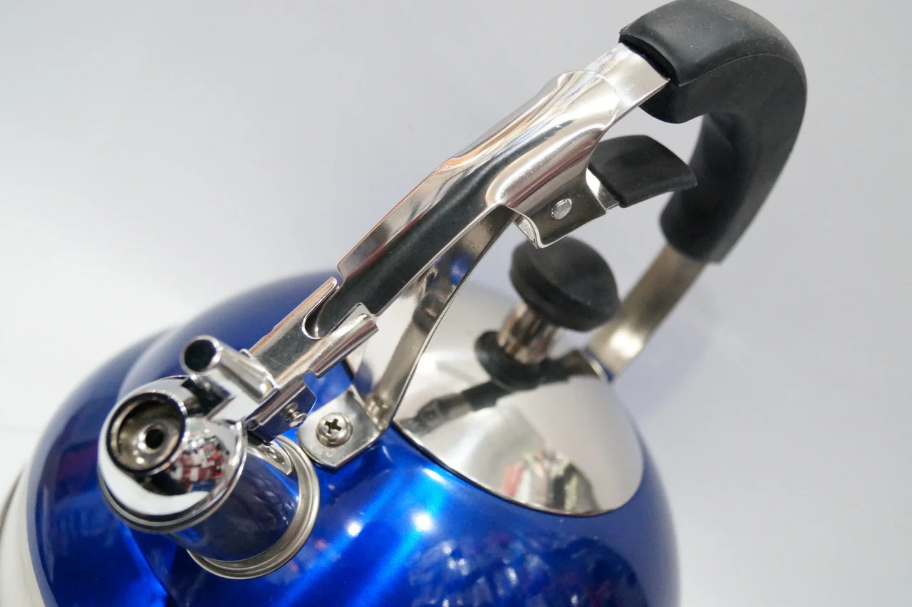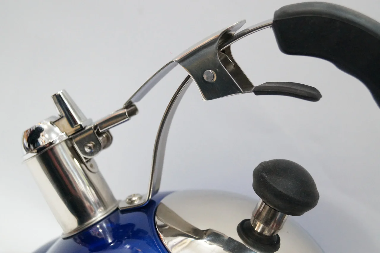 Ручка чайника выполнена из нержавеющей стали, она имеет специальную пластиковую вставку, которая позволяет пользоваться чайником без прихватки. А с помощью удобной клавиши на ручке вы можете открывать свисток и наливать воду. Стальная крышка сверху покрыта прорезиненным материалом, благодаря чему она не нагревается.