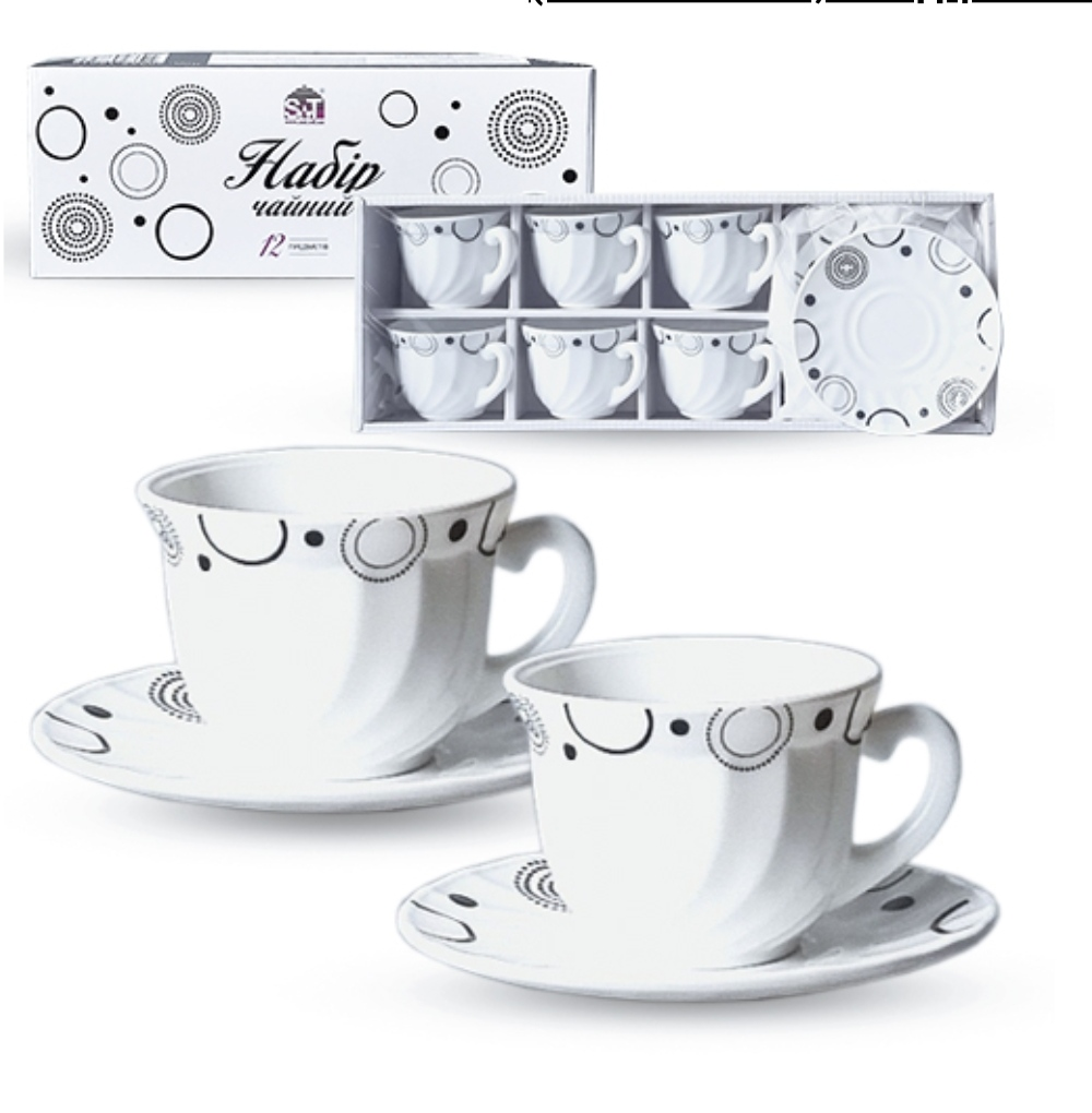 Набор чайный из стеклокерамики, 12 предметов- 6 чашек и 6 блюдец. Абстракция