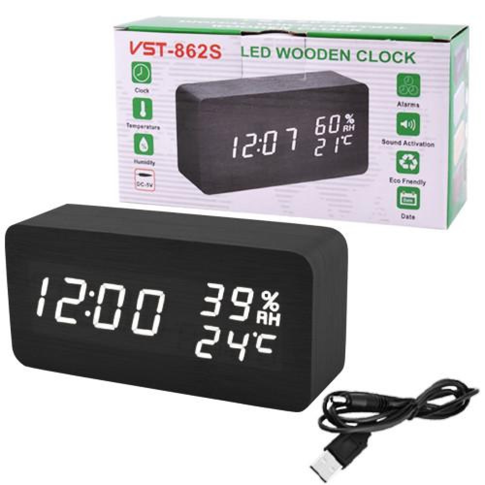 Часы сетевые VST-862S-6 белые, (корпус черный) температура, влажность, USB