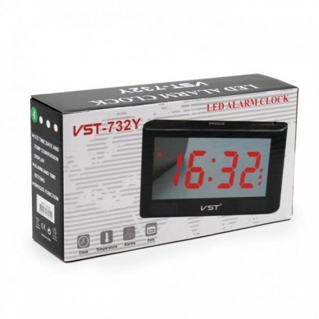 Часы настольные VST 732, с яркой подсветкой электронного циферблата, украсят своим стильным дизайном вашу комнату или рабочий офис. Форма часов – классическая, прямоугольная, плоский корпус держится на широкой устойчивой ножке-основании, под небольшим углом. Светодиодный дисплей прибора проинформирует вас о времени, а также о том, включён ли будильник (для этого есть маленький диод-индикатор с левой стороны). Цифры на экране высокие, чёткие, время хорошо видно и в солнечный день, и в тёмное время суток при выключенном свете.