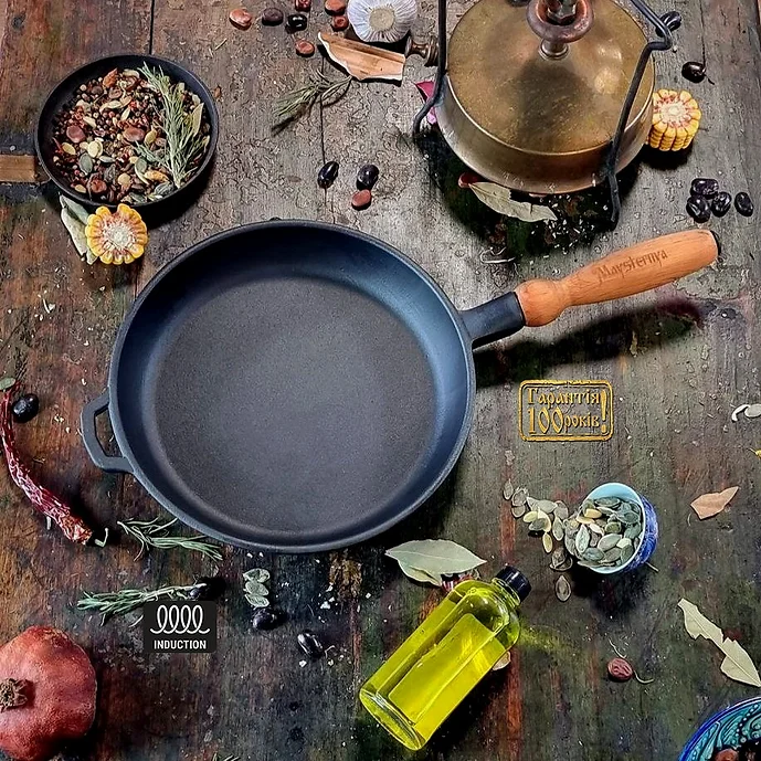 Сковорода чугунная блинная Maysternya Ø22см, глубина 2,5см с деревянной ручкой