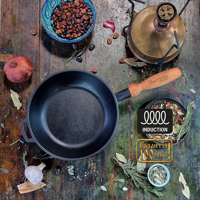 Сковорода чугунная гриль Maysternya 28х28см, глубина 4см с деревянной ручкой