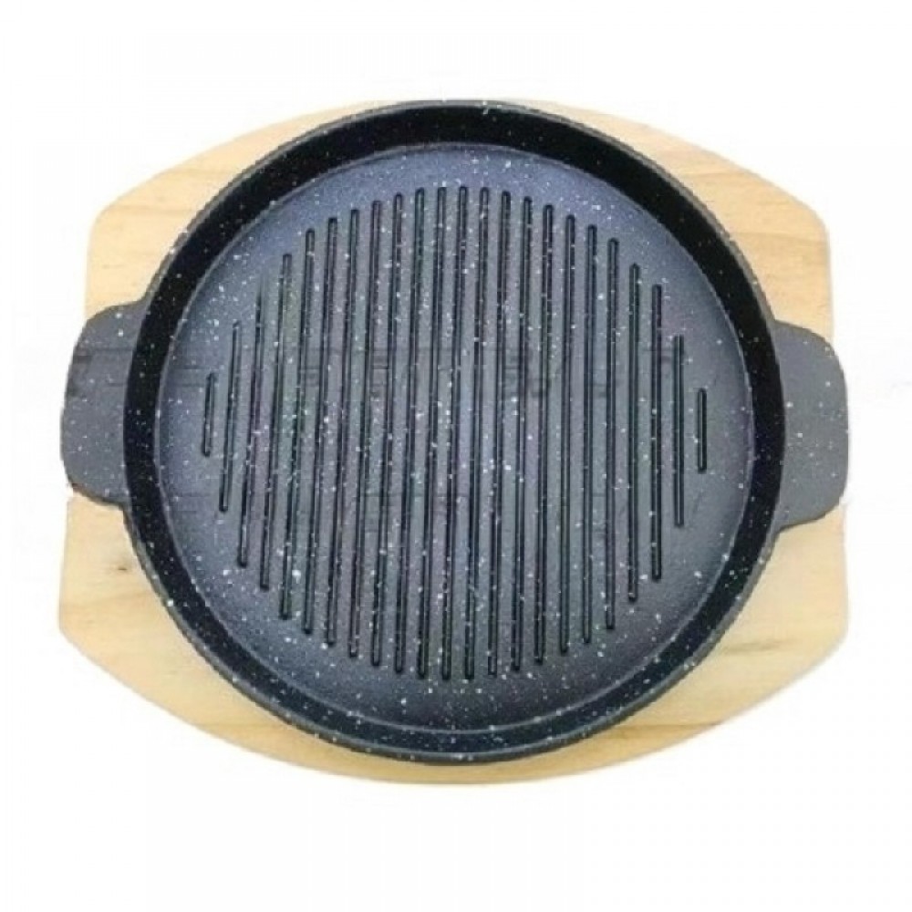 Чугунная порционная сковорода на деревянной подставке используется для приготовления и подачи горячих блюд как в кафе, ресторанах, так и дома. Такие сковороды подходят для приготовления на всех типах плит и печей, а также в духовых шкафах. Характеристики: Сковорода-гриль с мраморным покрытием. Форма - Круглая. Размер: 24x1,8 см