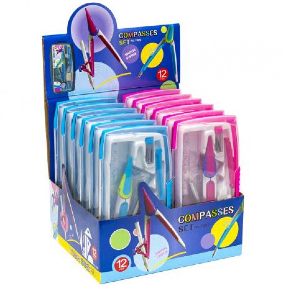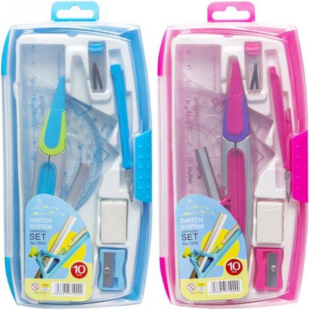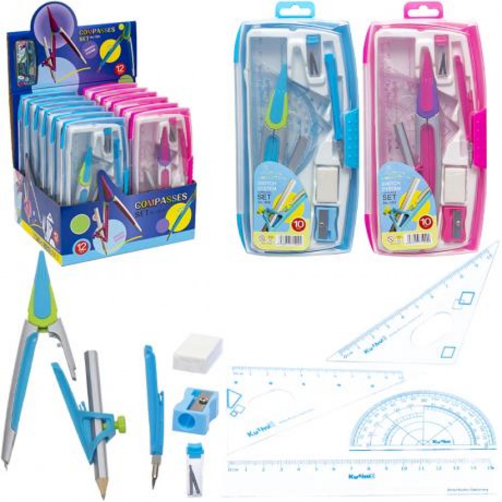 У пластиковій коробці. У наборі циркуль, олівець, 2 грифелі та додаткова "ніжка" для циркуля, транспортир, лінійка, 2 трикутники, гумка, точила Розмір 18х10 см