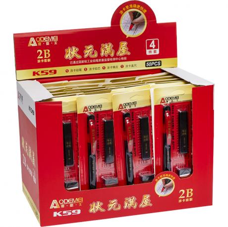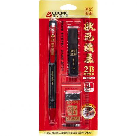 У наборі: олівець з плоским грифелем, лінійка 15см, запаски до олівця 2В, гумка. Розмір 19,5*8,5см