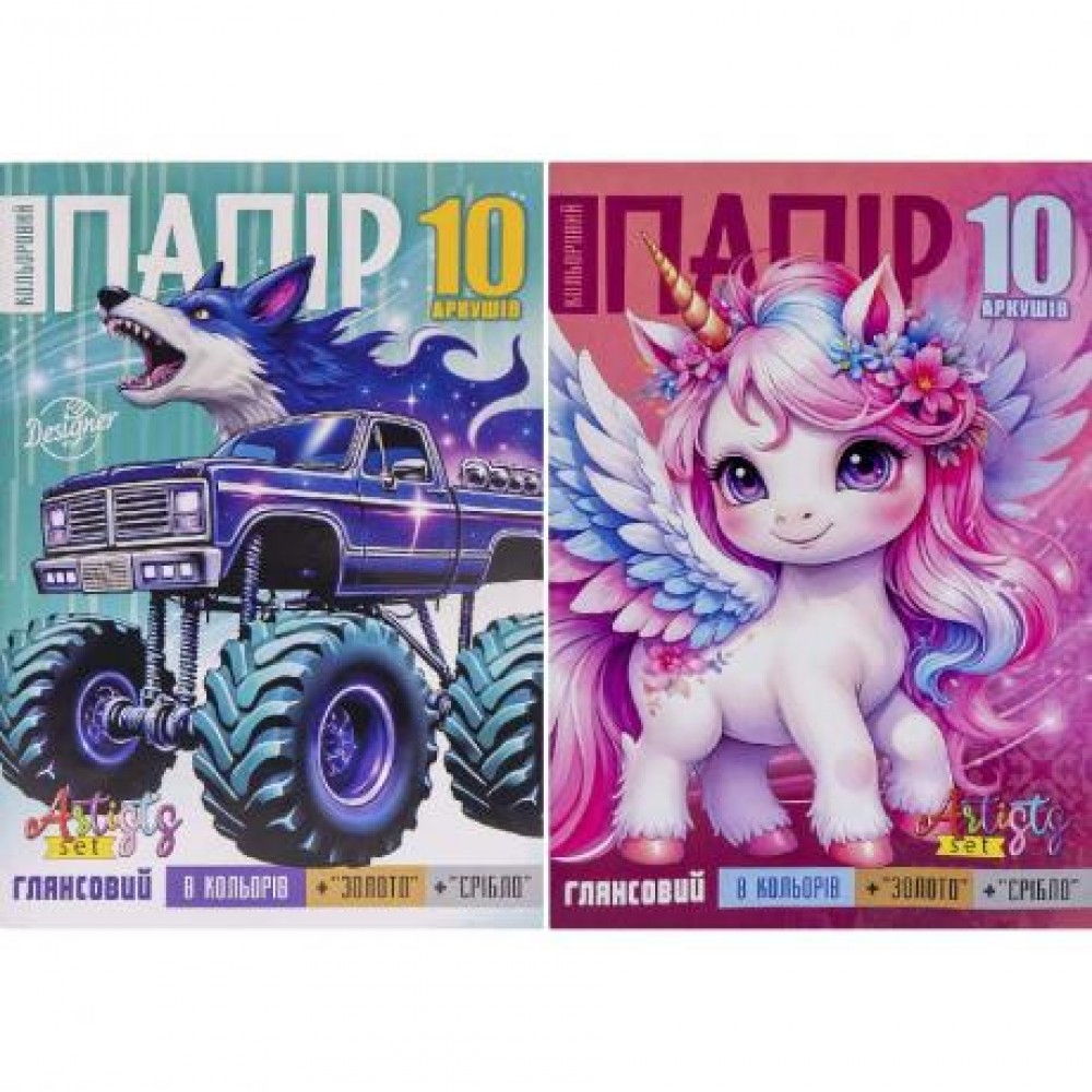Папір глянцевий односторонній, 210×297 мм, 10 аркушів — чудовий вибір для творчих проєктів, аплікацій, оформлення, друку та скрапбукінгу. Виготовлений з крейдованого паперу щільністю 90 г/м² із глянсовим покриттям. Друк яскравий, повнокольоровий 4+4 (CMYK). Хоча папір вказаний як односторонній, кольори нанесені з обох боків, одна сторона — глянцева, інша — менш блискуча.