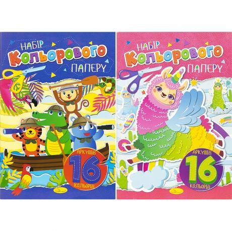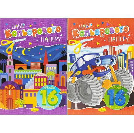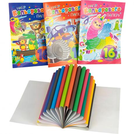 Набір кольорового паперу для дитячої творчості, шкільних занять, аплікацій, виробів і оформлення, містить 16 аркушів офсетного паперу щільністю 80 г/м² у форматі 200×295 мм, представлено 16 різнокольорових аркушів, обкладинка виготовлена з крейдованого паперу щільністю 115 г/м² із сучасним дизайном, надійне скріплення скобою запобігає випадінню аркушів, ідеально підходить для домашнього використання, творчих гуртків, дитячих садків і шкіл.