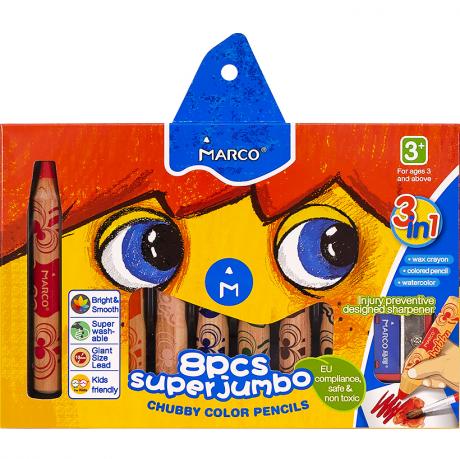Олівці кольорові акварельні Marco 8 кольорів. 3 в 1: воскову крейду, кольоровий олівець, акварель. Розроблений спеціально для дітей від 3-х років. Легко змивається з рук і одягу. Екологічно безпечний і нетоксичний. Діаметр олівця 15 мм, грифель 10 мм. Розмір 22х15х3,5 см. Вік 3+
