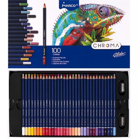 Олівці кольорові Marco Chroma 100 кольорів 8010 /100CB. Олівці цієї серії отримали нове колірне рішення корпусу, з нумерацією кожного кольору відповідно до колірної палітрою Marco.Стержень олівців CHROMA, за своїм складом і якістю, відкриває нову лінійку в довгому асортиментному ряді продукції торгової марки Marco. Товщина стрижня 3,3 мм, що не є чимось незвичайним, але властивості для малювання виводять стрижень на якісно новий рівень в розряд Cупер Преміум. Стрижень має підвищену гладкістю і покриваністю, крім того радує соковитістю наносяться квітів і м'якістю їх нанесення. Упаковка картон.