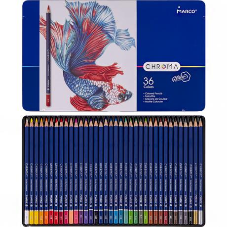 Олівці кольорові Marco Chroma 36 кольорів 8010 /36TN. Олівці цієї серії отримали нове колірне рішення корпусу, з нумерацією кожного кольору відповідно до колірної палітрою Marco.Стержень олівців CHROMA, за своїм складом і якістю, відкриває нову лінійку в довгому асортиментному ряді продукції торгової марки Marco. Товщина стрижня 3,3 мм, що не є чимось незвичайним, але властивості для малювання виводять стрижень на якісно новий рівень в розряд Cупер Преміум. Стрижень має підвищену гладкістю і покриваністю, крім того радує соковитістю наносяться квітів і м'якістю їх нанесення. Упаковані в металевий пенал.