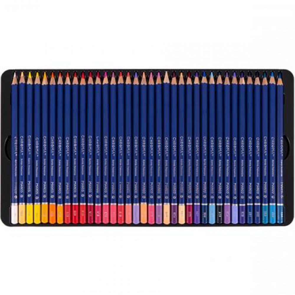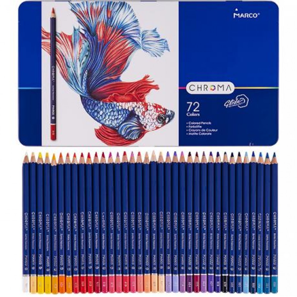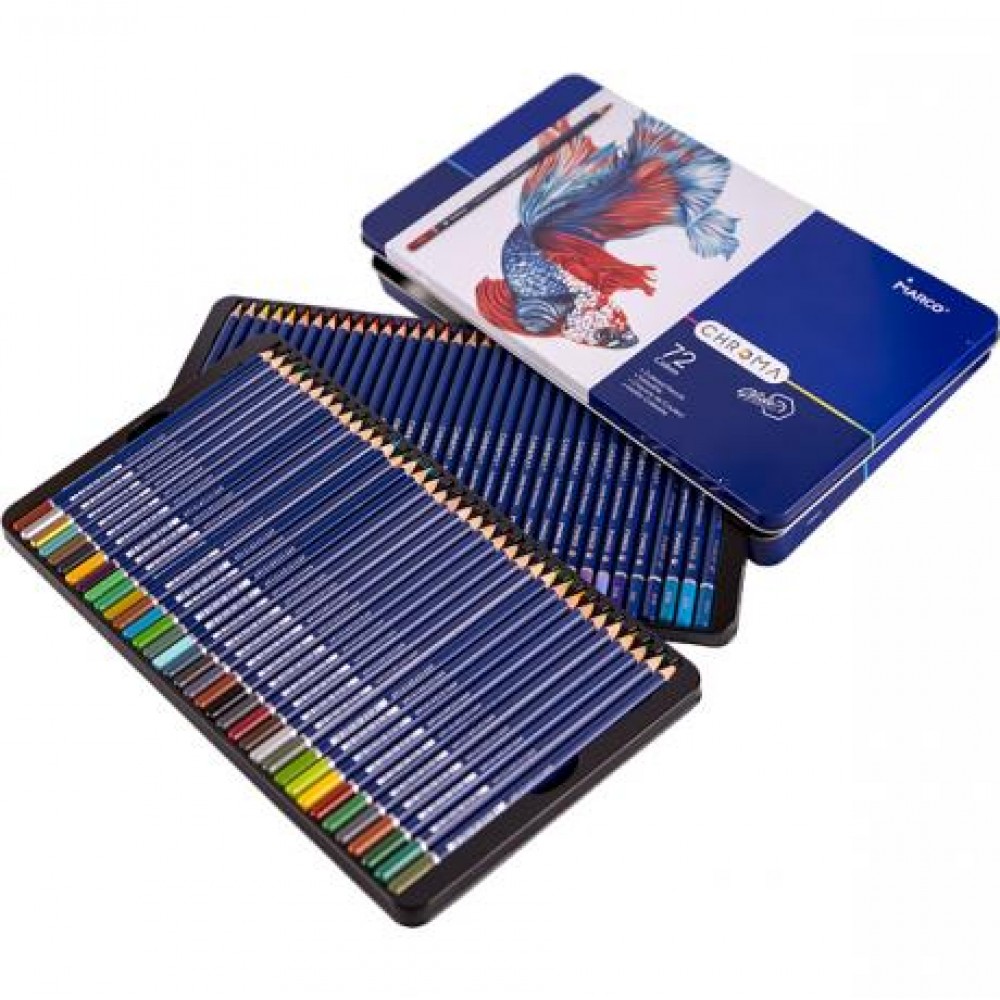 Олівці кольорові Marco Chroma 72 кольорів 8010 /72TN. Олівці цієї серії отримали нове колірне рішення корпусу, з нумерацією кожного кольору відповідно до колірної палітрою Marco.Стержень олівців CHROMA, за своїм складом і якістю, відкриває нову лінійку в довгому асортиментному ряді продукції торгової марки Marco. Товщина стрижня 3,3 мм, що не є чимось незвичайним, але властивості для малювання виводять стрижень на якісно новий рівень в розряд Cупер Преміум. Стрижень має підвищену гладкістю і покриваністю, крім того радує соковитістю наносяться квітів і м'якістю їх нанесення. Упаковані в металевий пенал.