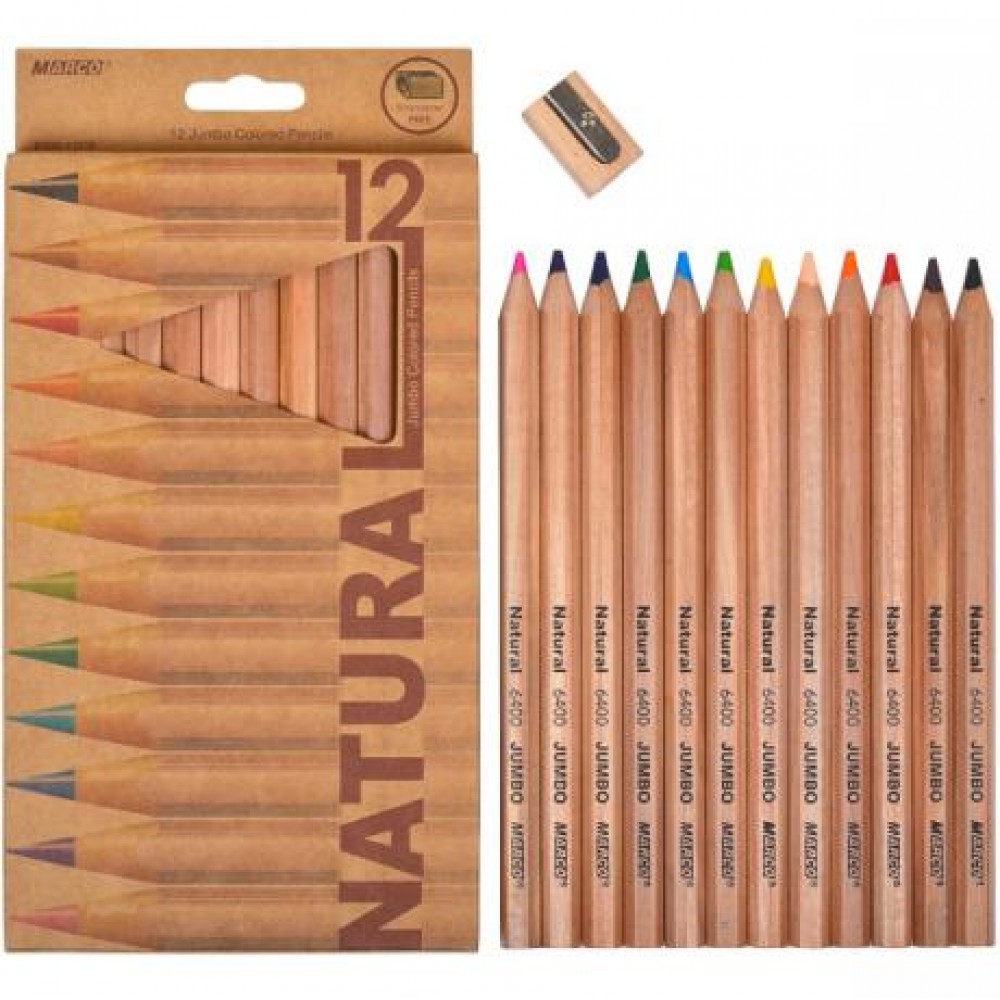 Кольорові олівці Marco 12 кольорів "Natural" jumbo. Варіант класичного набору кольорових олівців марки Marco. Олівці вироблені за передовими технологіями, із натуральної деревини молодого кедра преміум класу. Грифель олівців міцний 3мм діаметром, при заточуванні не ламається і не кришиться, не вимагають сильного натиску. Шестигранний товстий дерев'яний корпус, глянцеве кольорове покриття корпусу, Довжина 175мм, діаметр грифеля 5 мм, заточені. Потовщений корпус олівця (Jumbo) зручний для малювання малюкам.