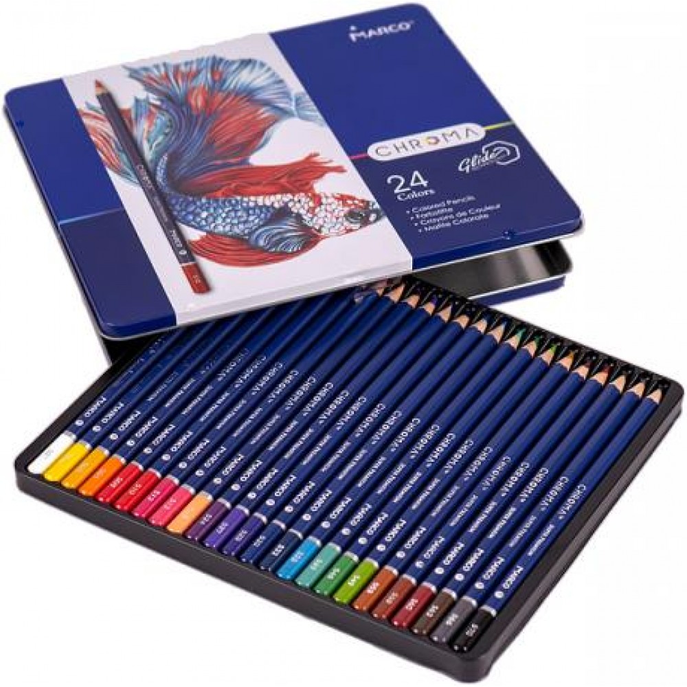 Олівці кольорові Marco Chroma 24 кольорів 8010 /24TN. Олівці цієї серії отримали нове колірне рішення корпусу, з нумерацією кожного кольору відповідно до колірної палітрою Marco.Стержень олівців CHROMA, за своїм складом і якістю, відкриває нову лінійку в довгому асортиментному ряді продукції торгової марки Marco. Товщина стрижня 3,3 мм, що не є чимось незвичайним, але властивості для малювання виводять стрижень на якісно новий рівень в розряд Cупер Преміум. Стрижень має підвищену гладкістю і покриваністю, крім того радує соковитістю наносяться квітів і м'якістю їх нанесення. Упаковані в металевий пенал.