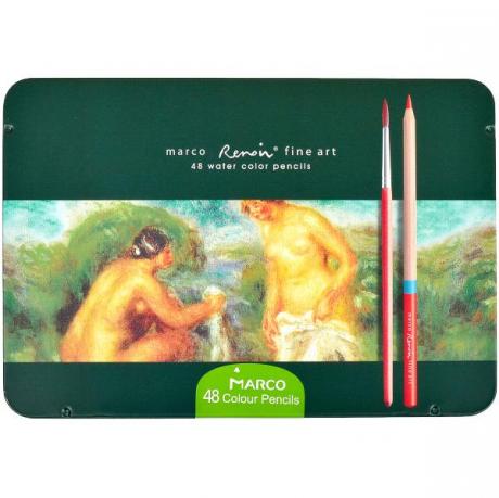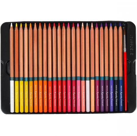 Набір кольорових художніх водорозчинних олівців "Renoir Fine Art Aqua" в металевій коробці. 48 кольорів + 1 кисть. Деревина високої якості, не ламається. Ідеально підходять для ескізів, малюнків, ілюстрування і розфарбовування. Олівці розкладені на двох платформах. Твердість: B. Діаметр грифеля: 3,7 мм