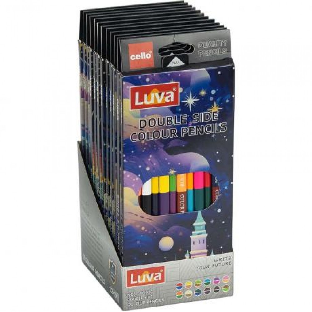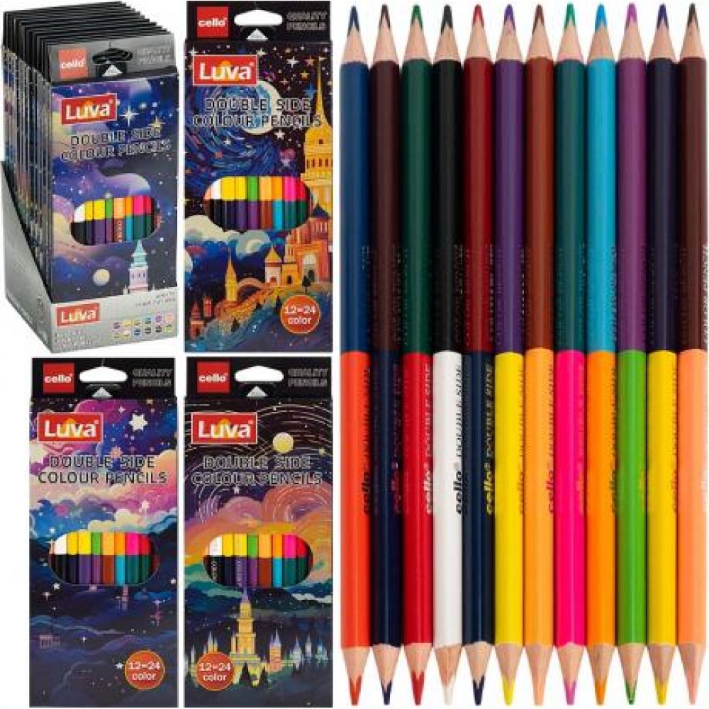 Унікальний набір кольорових олівців LUVA: 12 двосторонніх олівців = 24 кольори! Ідеально підходять для шкільних занять, розмальовок і творчих проєктів. Легко заточуються, залишають яскравий і рівномірний слід. Компактний формат дозволяє економити місце в пеналі. Стильна упаковка з яскравим дизайном — чудовий варіант для подарунка.