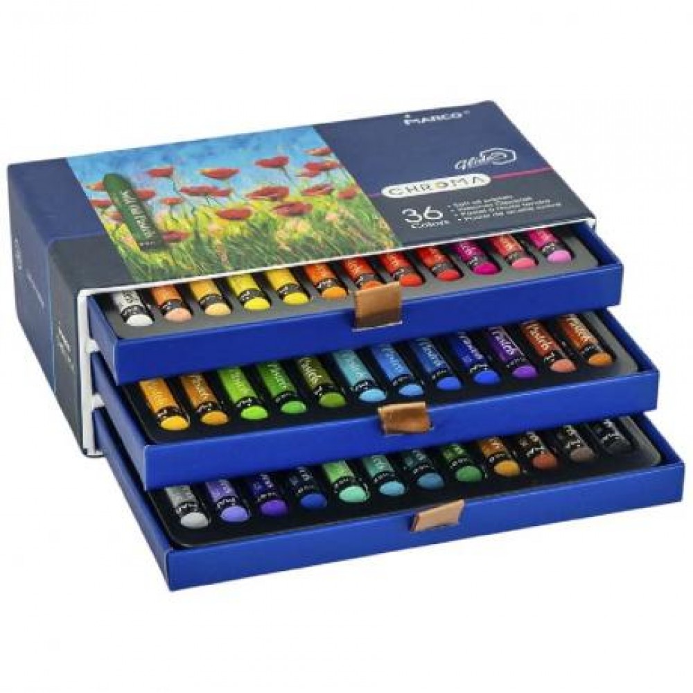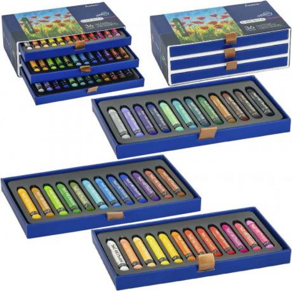 Нова олійна пастель є повністю професійною. Нова пастель легко і жирно накладається на поверхню, причому вона чудово накладається на полотно. Має більш високу світлостійкість. Упаковка картонна коробка. У наборі 36 кольорів. Розмір упаковки 20х12х7 см.