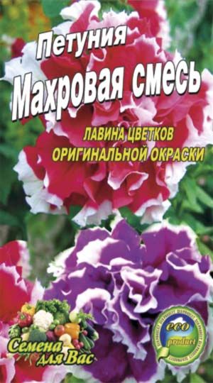 Петуния Махровая смесь Однолетнее растение. Стебли прямостоячие, ветвистые, высотой 25-40см. Цветки махровые, диаметром 5-7см, разнообразных однотонных и двуцветных окрасок. Выращивают посевом семян в грунт в мае-июне или для более раннего цветения, через рассаду в марте-апреле. Цветет обильно с июня до поздней осени. Используется для оформления клумб, рабаток, балконов и садовых ваз.