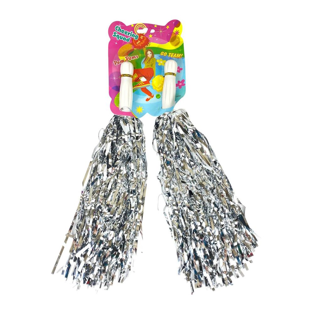 Помпоны для чирлидинга и танцев серебряные 2 шт, с ручкой (0815-100 silver)
