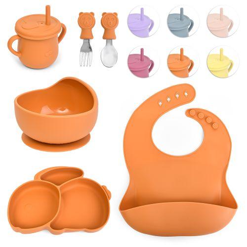Посуда детская силиконовая "Зайка" 6пр/наб (вилка, ложка, чашка с трубочкой, слюнявчик, тарелки 2шт) см