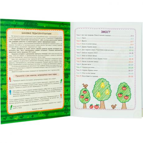 Матеріал зошита скомпонований відповідно до природного сезонного циклу, допоможе поглибити та систематизувати знання дитини про живу й неживу природу: погодні явища, рослинний і тваринний світ тощо. Видання призначений для роботи з дітьми молодшого дошкільного віку (4-й рік життя) і спрямовано на формування у них первинної екологічної компетентності, тобто системи реалістичних уявлень про природне довкілля та елементарних правил природокористування. Формат А4 26*220см , 32 сторінки