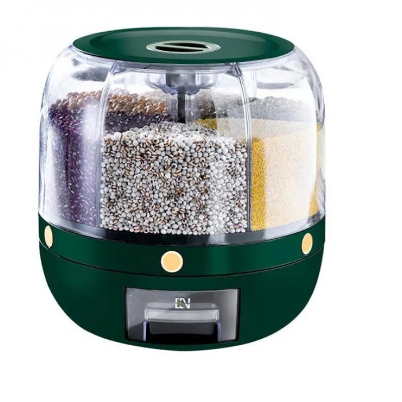 Прозрачный вращающийся диспенсер для сыпучих продуктов с дозатором – отличное решение для хранения различных круп, кофе, сухих завтраков и др. Сохраняет продукты сухими и свежими и отлично организует пространство. Вращающийся контейнер для продуктов можно поставить в угол стены и компактно организовать. Контейнер для круп изготовлен из экологичного пищевого пластика, безопасный и долговечный. Диспенсер легко помещается в кухонный шкаф и организовывает хранение разных видов продуктов.Контейнер для круп, легко и без усилий вращается на 360 градусов, что поможет вам в удобстве пользования крупами.Для удобства пользования емкость для круп, под каждой секцией расположен дозатор. Подача круп происходит при нажатии на кнопку в нужном отсеке.В середине контейнера есть специальный отсек для природных средств от насекомых, в который можно положить: чеснок, лавровый лист, гвоздику, анис, цедру лимона.В диспенсере имеется 6 секций, в которых можно хранить крупы разных видов, а также другие продукты: чай, кофе в зернах, различные травы для чая, орехи, сухофрукты, конфеты