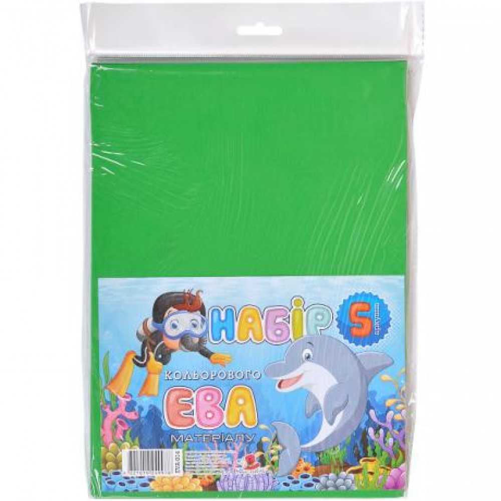 Фоаміран EVA-014 зеленого кольору формату А4 (21х29,7 см) товщиною 2,00 мм. У комплекті 5 аркушів. Використовується в рукоділлі для створення флористичного декору, біжутерії, прикрас, весільних композицій, подарункових упаковок та вітальних листівок. Підходить для дитячої творчості, включаючи виготовлення аплікацій та виробів.