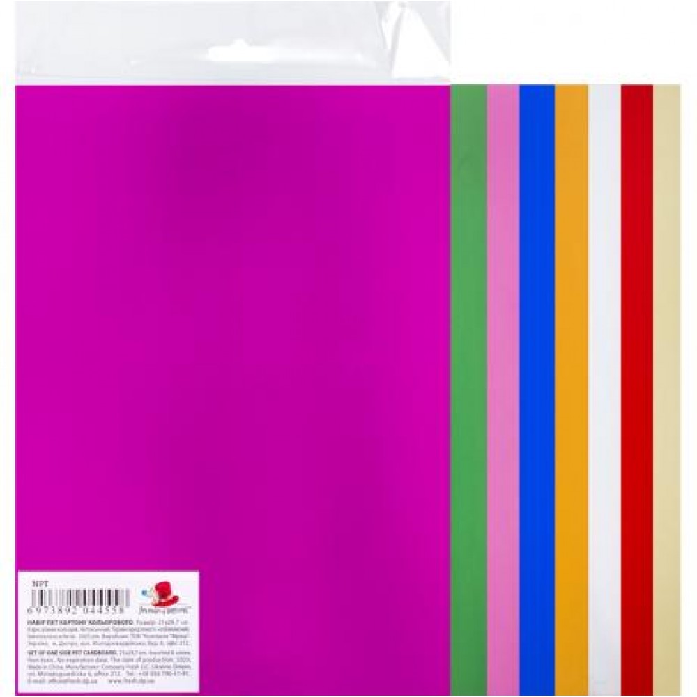 Набір ПЕТ картону A4 односторонній, модель NPT/044558. Включає 8 аркушів різних кольорів. Щільність картону становить 220±10 г/м². Розмір аркуша A4: 21 x 29.7 см.