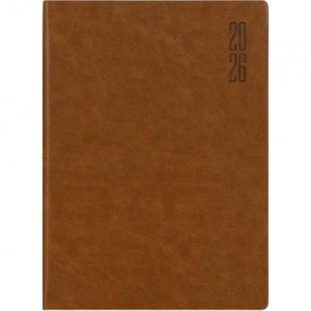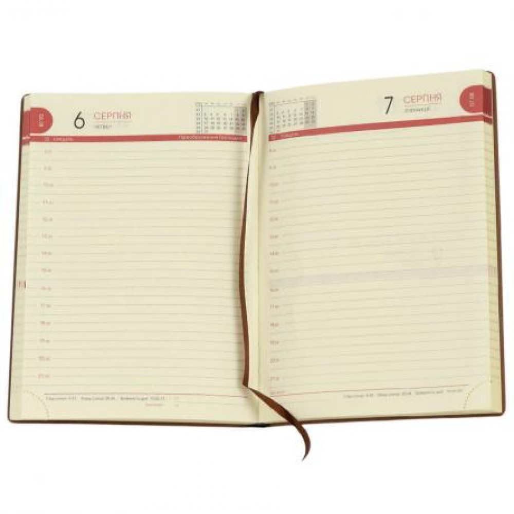 Щоденник формату A5 на кремовому папері щільністю 70 г/м². Блок надрукований у 2 кольори українською мовою. Гнучка обкладинка зі штучної шкіри із заокругленими кутами. Форзац кремового кольору без друку, є лясе-закладка. Кожен аркуш має перфорацію нижнього зовнішнього кута для зручного відстеження дат.