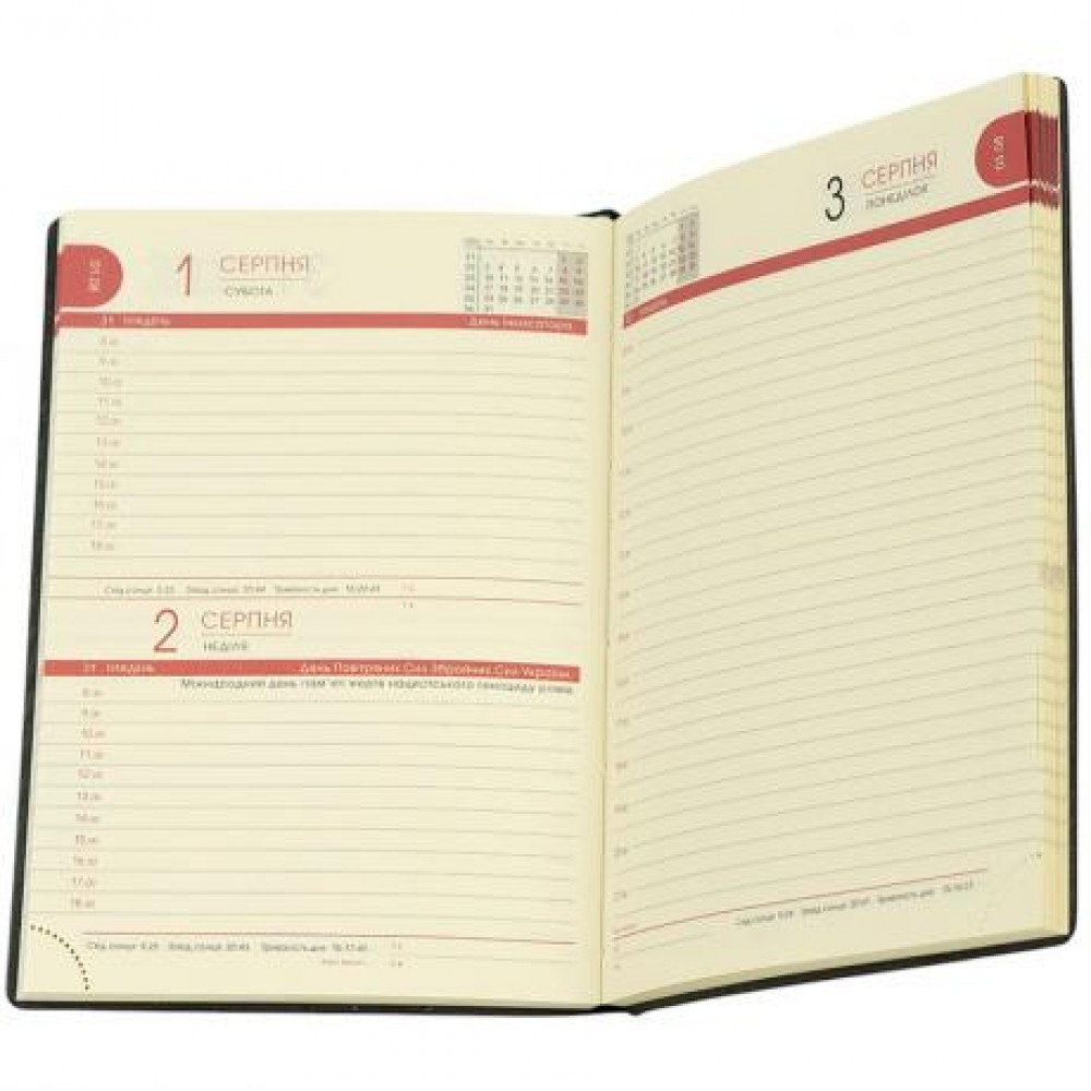 Щоденник датований 2026, А5, 160 сторінок Стильний щоденник формату А5 на кремовому папері щільністю 70 г/м². Блок надрукований у 2 кольори українською мовою. Гнучка обкладинка зі штучної шкіри із заокругленими кутами. Форзац кремового кольору без друку, є лясе-закладка. Кожен аркуш має перфорацію нижнього зовнішнього кута для зручного відриву. Індивідуальна упаковка в прозорий пакет.