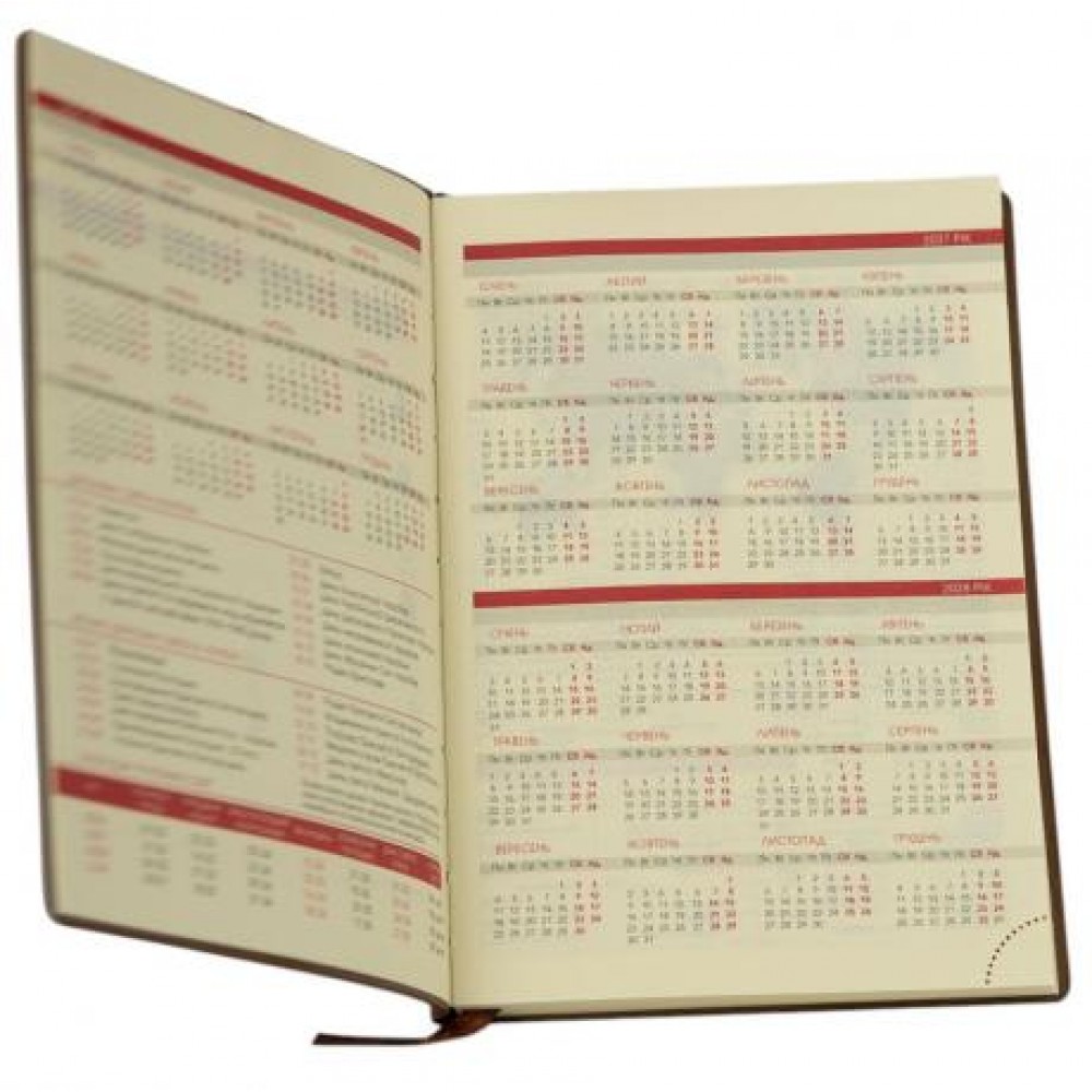 Стильний щоденник формату А5 на кремовому папері щільністю 70 г/м². Блок надрукований у 2 кольори українською мовою. Гнучка обкладинка зі штучної шкіри із заокругленими кутами. Форзац кремового кольору без друку, є лясе-закладка. Кожен аркуш має перфорацію нижнього зовнішнього кута для зручного відриву.