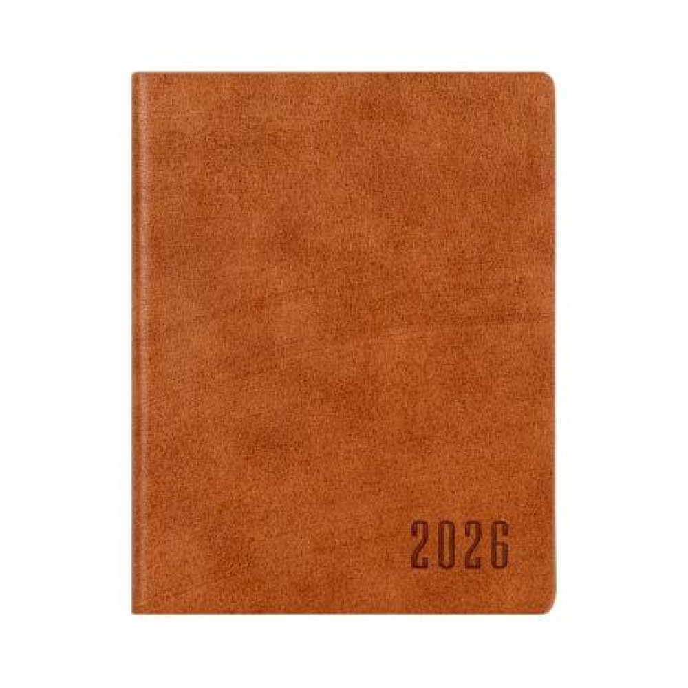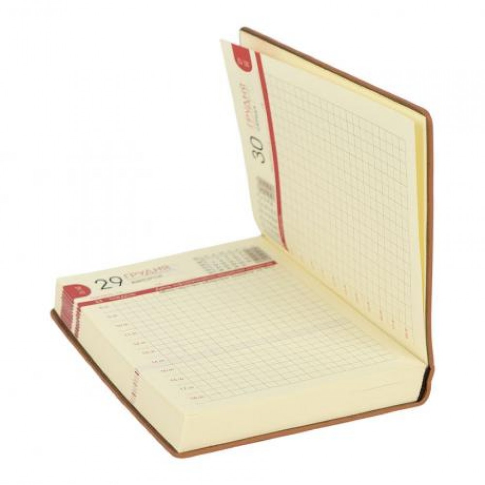 Компактний щоденник формату A6 на кремовому папері щільністю 70 г/м². Внутрішній блок надрукований у 2 кольори українською мовою. Гнучка обкладинка зі штучної шкіри із заокругленими кутами. Форзац кремового кольору без друку, є закладка‑ляссе.