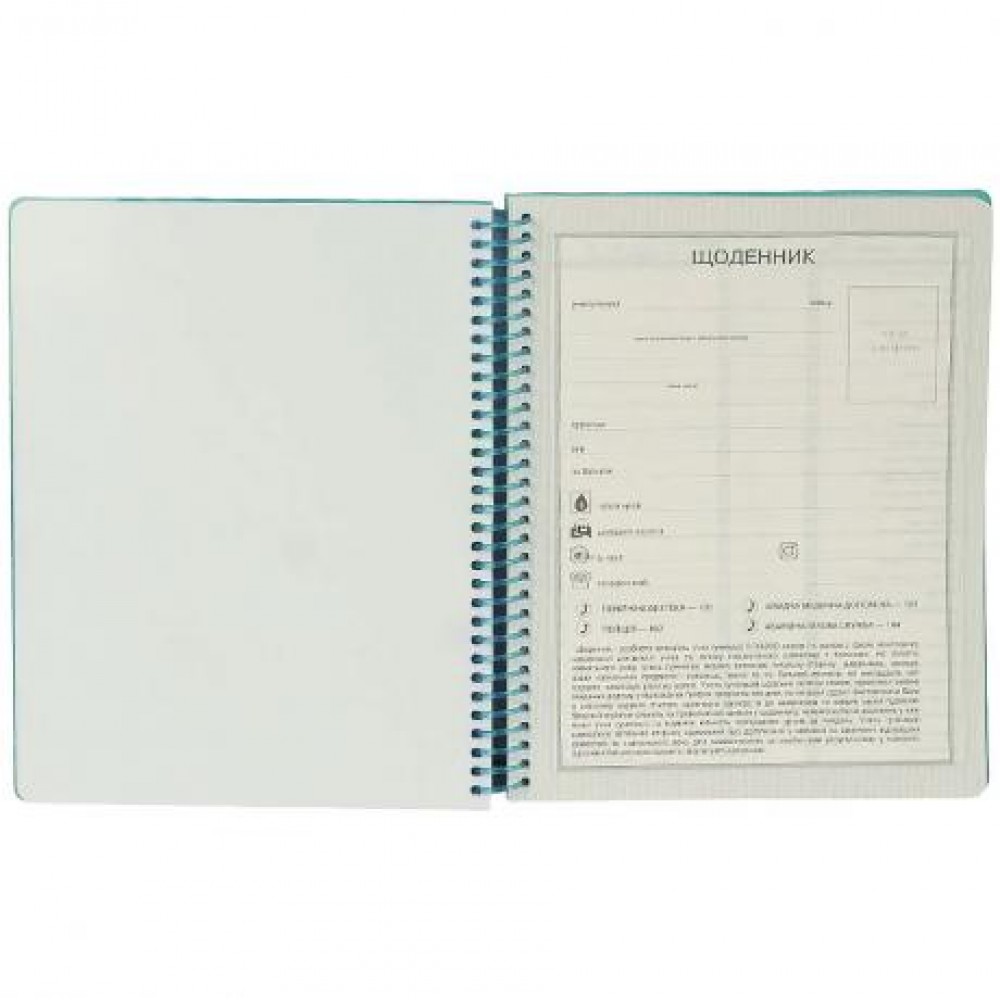Щоденник шкільний 165*208 mm. 40 арк. Пластикова прозора обкладинка 350мікрон на СПІРАЛІ (одинарна ПЛАСТИКОВА спіраль, товщина дроту 2 мм, діаметр кілець 1,5 см).Папір кремового кольору 70г/м2, друк 1+1, на Українській мові. ОДНО-кольоровий друк (1+0) кольорами PANTONE. Індивідуальне пакування в прозорому пакетi зі стікером