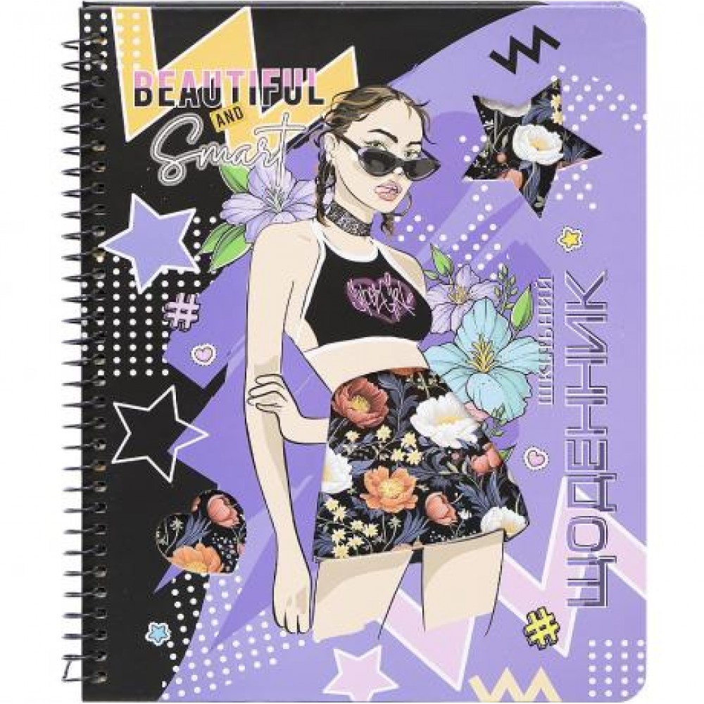 Щоденник шкільний 165*208 mm, 40 аркушів.Тверда обкладинка на СПІРАЛІ (одинарна МЕТАЛЕВА спіраль, товщина дроту 1,2 мм). Папір кремового кольору 70г/м2, друк 1+1, на Українській мові. Повнокольоровий друк 4+0 та матова ламінація + висічка частини зображення на обкладинці. Індивідуальне пакування в ОПП-пакетi зі стікером.