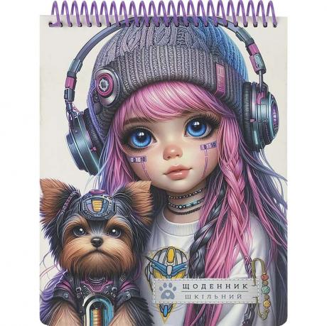 Щоденник шкільний 165*208 mm. 40 арк. Обкладинка з картону 500g/m2 на СПІРАЛІ (одинарна ПЛАСТИКОВА спіраль, товщина дроту 2 мм, діаметр кілець 1,5 см).Папір кремового кольору 70г/м2, друк 1+1, на Українській мові. Повнокольоровий друк 4+0 та матова ламінація. Індивідуальне пакування в прозорому пакетi зі стікером